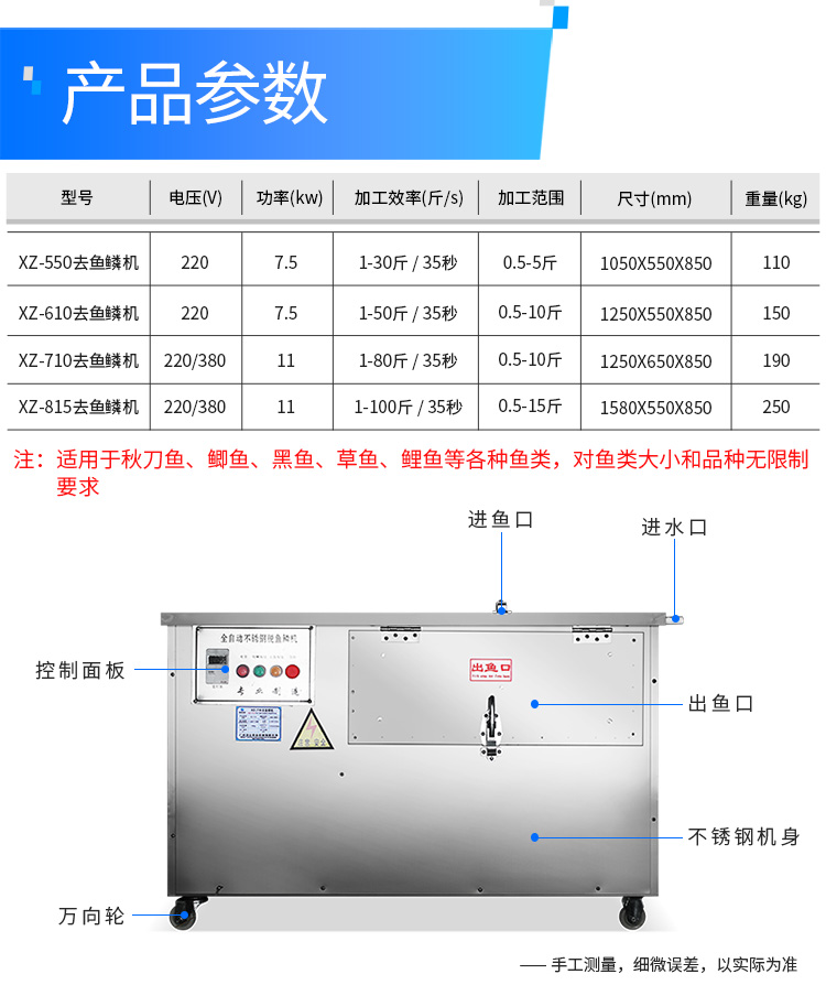 型號 | XZ-550去魚鱗機(jī) | XZ-610去魚鱗機(jī) | XZ-710去魚鱗機(jī) | XZ-815去魚鱗機(jī) |