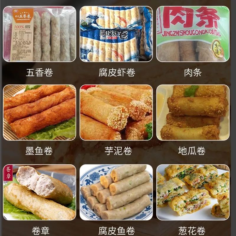 / 腐皮卷機(jī)是一款完全取代手工包各種腐皮類的機(jī)器,完全解決傳統(tǒng)手工包個(gè)種肉卷、卷章、魚卷、蝦卷、福建五香卷、潮汕肉條、腐皮蝦卷、墨魚卷、芋泥卷、地瓜卷等各種卷類食品。做出的各種卷類食品造型好看、長(zhǎng)短均勻,葉片泵的供料機(jī)不破壞物料原有形狀,獨(dú)有的圓形收口切斷設(shè)計(jì)使其接近手工制作。全自動(dòng)包漿、卷?xiàng)l、切斷成型,大大的提升了生產(chǎn)效率,滿足了批量化生產(chǎn)的速度要求。/